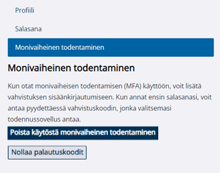 Jos haluat ottaa käyttöön monivaiheisen todentamisen (MFA), määrittele todennussovellus puhelimeesi esimerkiksi skannaamalla palvelun QR-koodi. Seuraa sivulla näkyviä ohjeita määrittelyn eri vaiheissa. Määrittämällä todennussovelluksen voit lisätä sisäänkirjautumiseen ylimääräisen vahvistuksen. Kun se on käytössä, salasanan antamisen jälkeen tulee antaa myös todennusskoodi puhelimesi todennussovelluksesta.